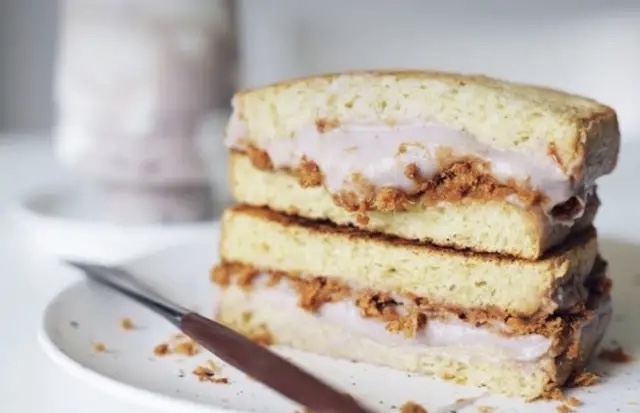 3.土司放入平底鍋烤出焦香味,拿出一片鋪上一層芋泥,再鋪上一層肉松,最后蓋上另外一片土司就好啦。